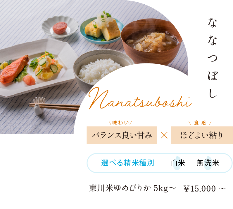 「ゆめぴりか」は柔らかい品種でご飯として楽しみたい方におすすめで、「ななつぼし」は粒がしっかりしており冷めても美味しく粘りを抑えた料理をする際におすすめ。おむすびを作る際は、ゆめぴりか・ななつぼしをブレンドし、一合に対し大匙1杯分くらい水を減らし若干硬めに炊いてください。握る際に手で押し込むのでちょうど良くなり、あたたかくても冷めても美味しさが保たれるんです。