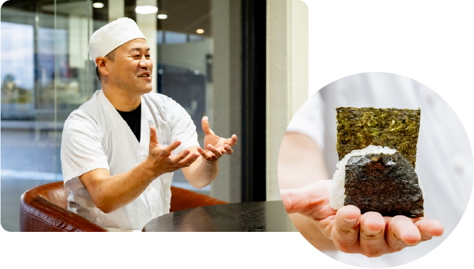育ったまちの水で炊くお米は格別です。お米を炊く時のコツは、さっと研いで30分くらい吸水、お米と水の黄金比は白米1号に対し180mlです。また、おむすびを作る際は、ゆめぴりか・ななつぼしをブレンドし、一合に対し大匙1杯分くらい水を減らし若干硬めに炊くのがポイント。握る際に手で押し込むためちょうど良くなり、あたたかくても冷めても美味しさが保たれます。