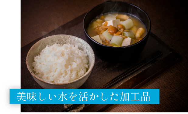 豆腐や味噌など地下水を惜しみなく使い、本物の味を追求した加工品が特徴です。