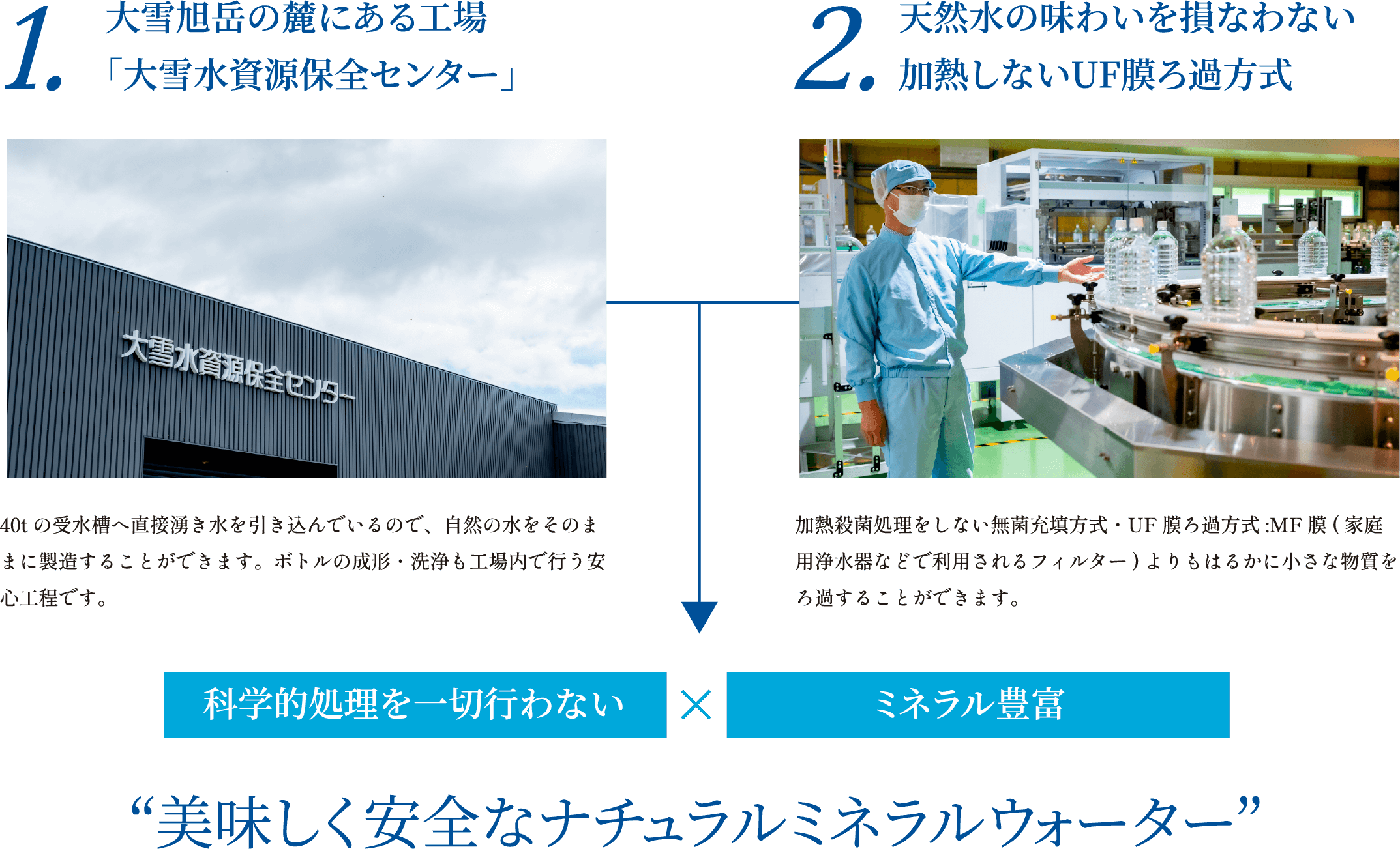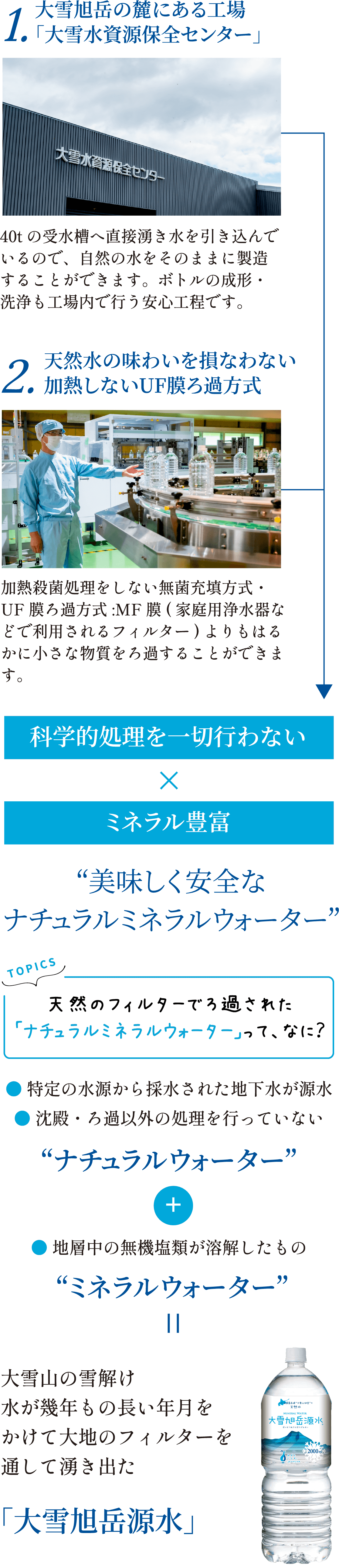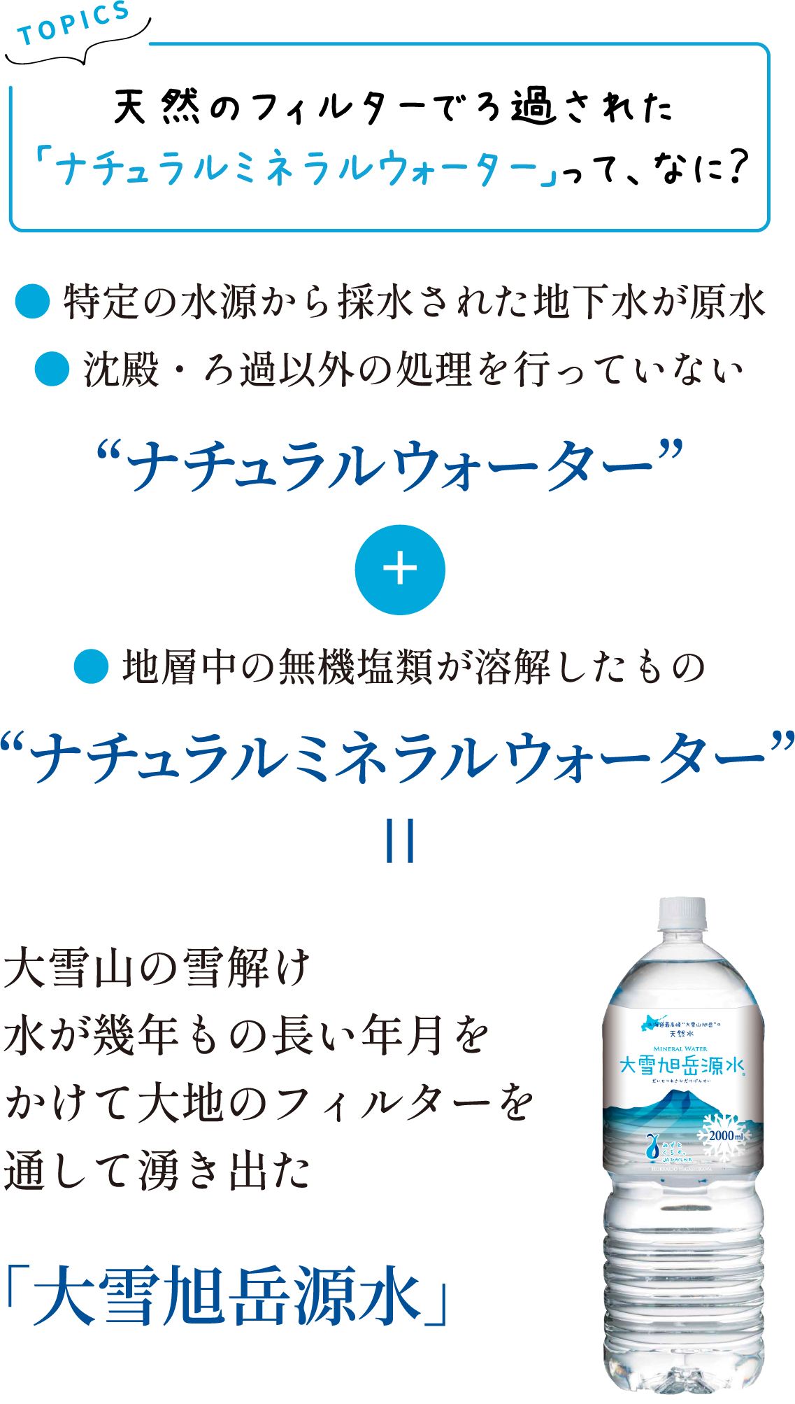 大雪山の雪解け水が、30〜50年の時をかけて地中に染み込み、天然のろ過を経て生まれた清らかな水。それを熱処理せず、空気にも触れさせずにボトルに詰めています。
